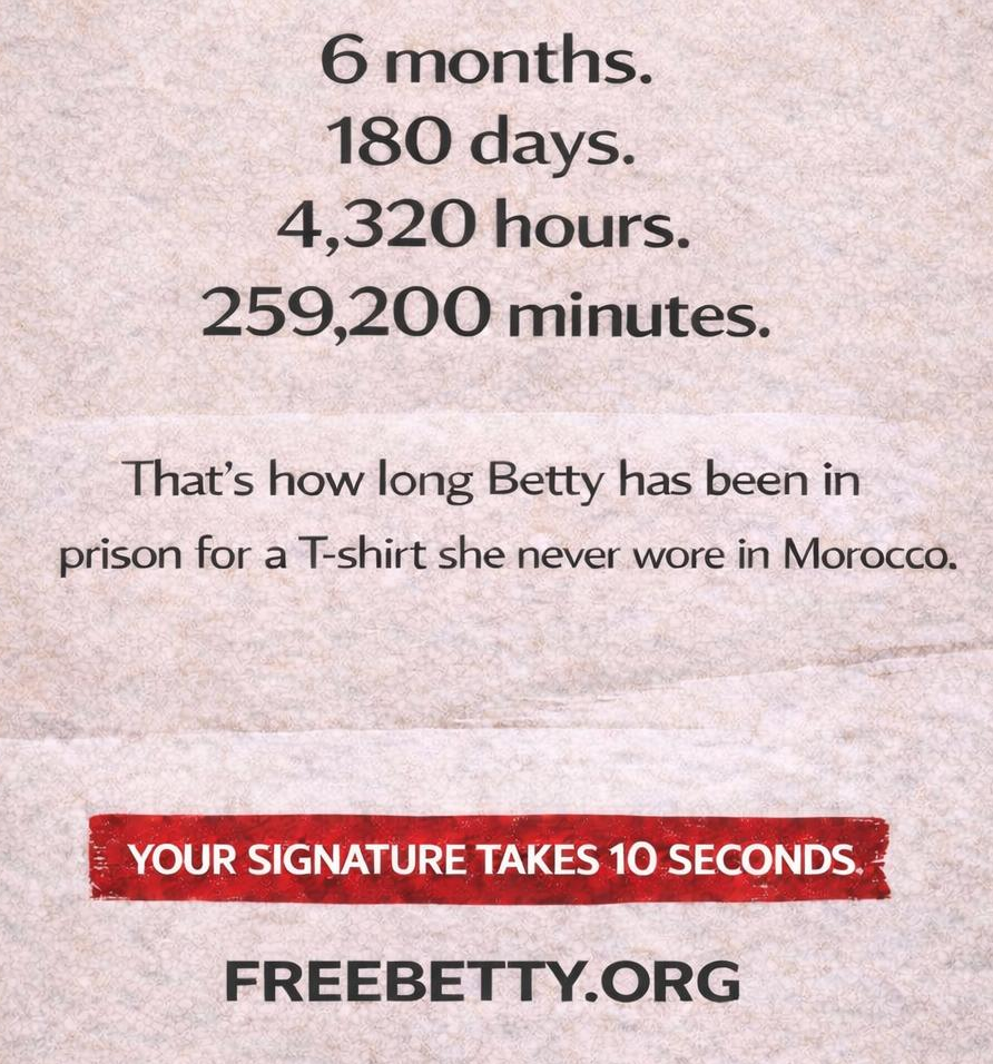 Betty was prosecuted for “insulting Islam”, a blasphemy charge rooted in Morocco’s oppressive religious laws. Also in Morocco, homosexuality is illegal under Article 489 of the Penal Code, which criminalizes “lewd or unnatural acts” between individuals of the same sex.