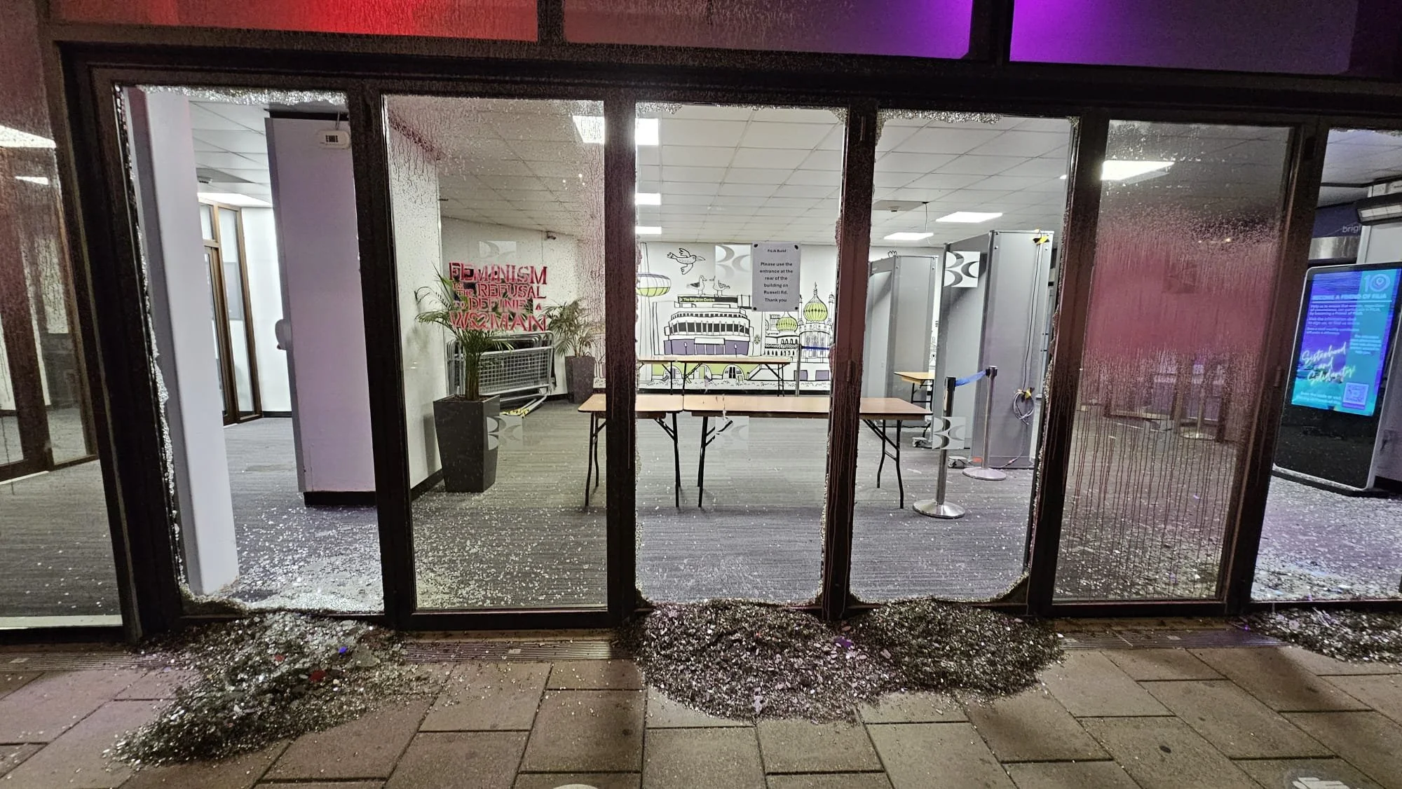 The female volunteers (including local residents) organising the FiLiA conference in October 2025 were subject to harassment and threats up to and including the three days of their feminist conference taking place in Brighton. These threats came to fruition when on the morning of the conference’s opening day, large sections of the Brighton Centre’s glass frontage were smashed, with Bash Back, which describes itself as a ‘trans-led direct-action group’, claiming responsibility.